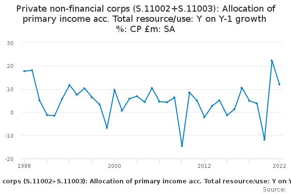 Download this time seriesPrivate non-financial corps (S.11002+S.11003): Allocation of primary income acc. Total resource/use: Y on Y-1 growth %: CP £m: SA