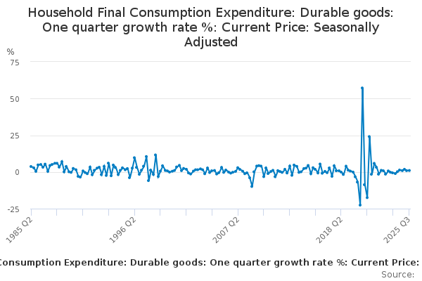 Download this time seriesHousehold Final Consumption Expenditure: Durable goods: One quarter growth rate %: Current Price: Seasonally Adjusted