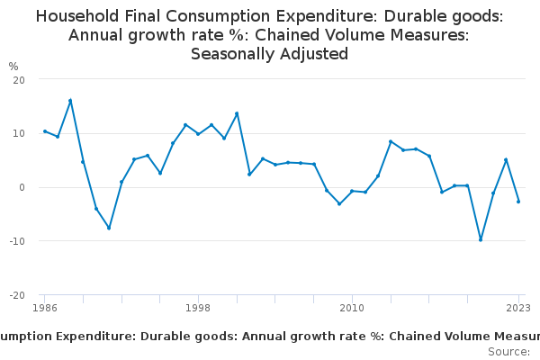 Download this time seriesHousehold Final Consumption Expenditure: Durable goods: Annual growth rate %: Chained Volume Measures: Seasonally Adjusted
