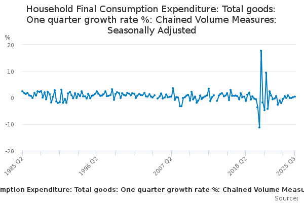 Download this time seriesHousehold Final Consumption Expenditure: Total goods: One quarter growth rate %: Chained Volume Measures: Seasonally Adjusted