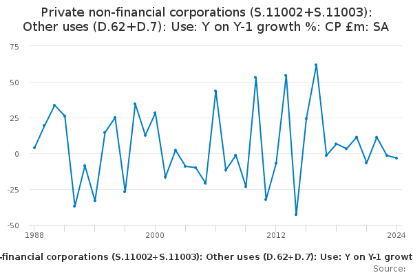 Download this time seriesPrivate non-financial corporations (S.11002+S.11003): Other uses (D.62+D.7): Use: Y on Y-1 growth %: CP £m: SA