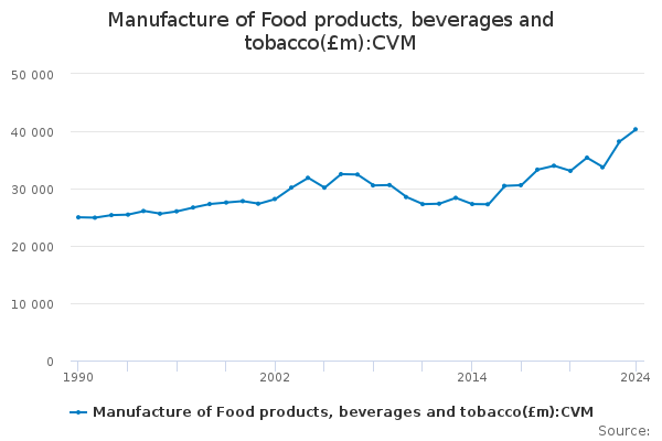 Download this time seriesManufacture of Food products, beverages and tobacco(£m):CVM