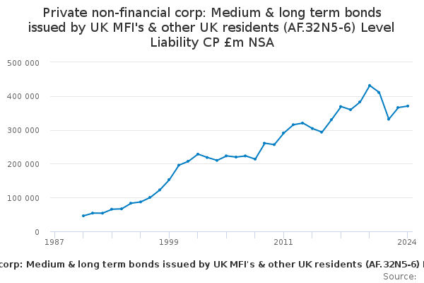 Download this time seriesPrivate non-financial corp: Medium & long term bonds issued by UK MFI's & other UK residents (AF.32N5-6) Level Liability CP £m NSA