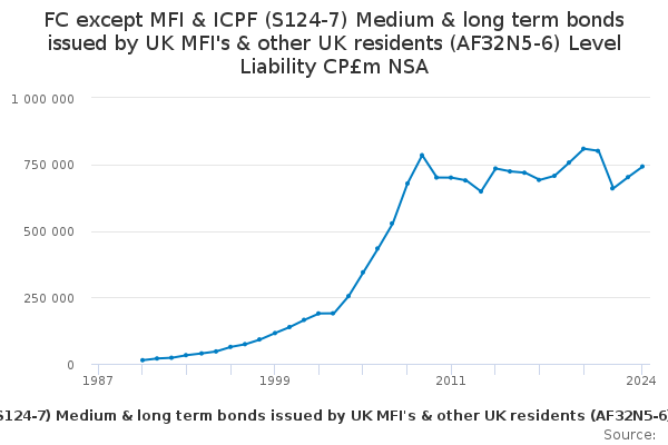 Download this time seriesFC except MFI & ICPF (S124-7) Medium & long term bonds issued by UK MFI's & other UK residents (AF32N5-6) Level Liability CP£m NSA