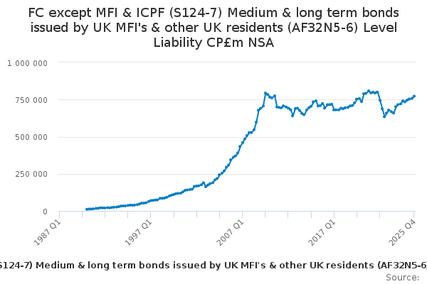 Download this time seriesFC except MFI & ICPF (S124-7) Medium & long term bonds issued by UK MFI's & other UK residents (AF32N5-6) Level Liability CP£m NSA