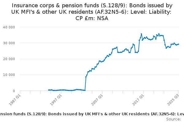 Download this time seriesInsurance corps & pension funds (S.128/9): Bonds issued by UK MFI's & other UK residents (AF.32N5-6): Level: Liability: CP £m: NSA