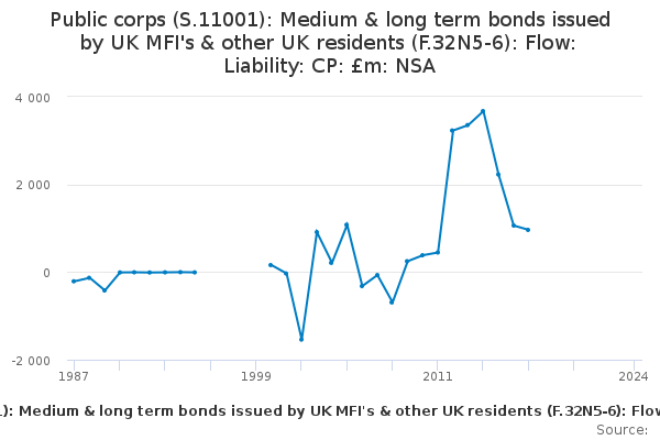 Download this time seriesPublic corps (S.11001): Medium & long term bonds issued by UK MFI's & other UK residents (F.32N5-6): Flow: Liability: CP: £m: NSA