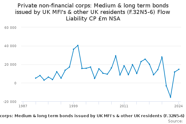 Download this time seriesPrivate non-financial corps: Medium & long term bonds issued by UK MFI's & other UK residents (F.32N5-6) Flow Liability CP £m NSA
