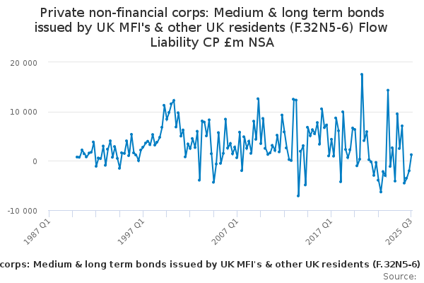 Download this time seriesPrivate non-financial corps: Medium & long term bonds issued by UK MFI's & other UK residents (F.32N5-6) Flow Liability CP £m NSA