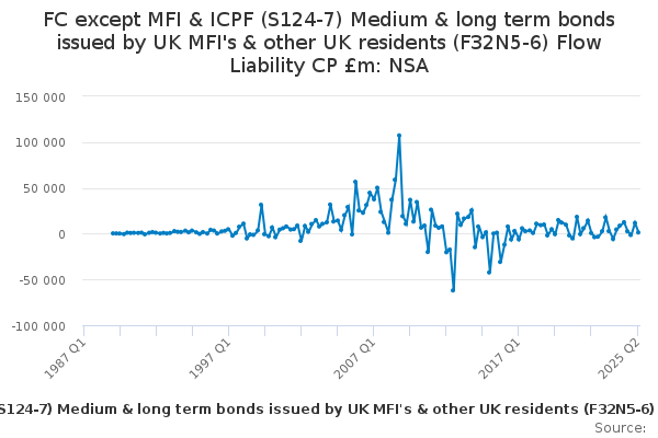 Download this time seriesFC except MFI & ICPF (S124-7) Medium & long term bonds issued by UK MFI's & other UK residents (F32N5-6) Flow Liability CP £m: NSA