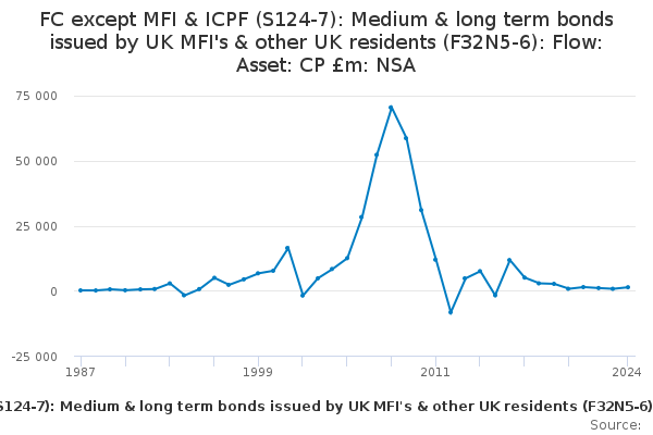 Download this time seriesFC except MFI & ICPF (S124-7): Medium & long term bonds issued by UK MFI's & other UK residents (F32N5-6): Flow: Asset: CP £m: NSA