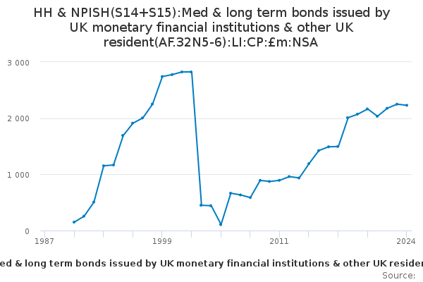 Download this time seriesHH & NPISH(S14+S15):Med & long term bonds issued by UK monetary financial institutions & other UK resident(AF.32N5-6):LI:CP:£m:NSA