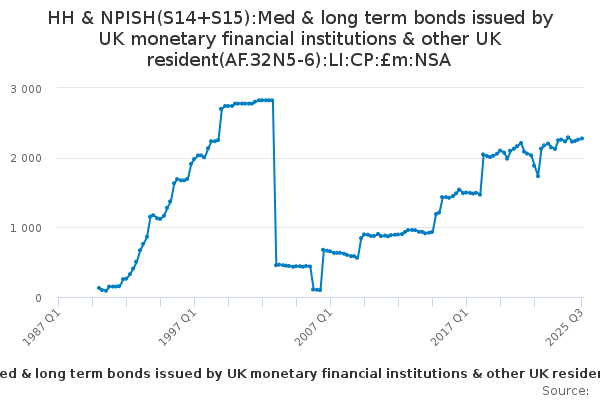 Download this time seriesHH & NPISH(S14+S15):Med & long term bonds issued by UK monetary financial institutions & other UK resident(AF.32N5-6):LI:CP:£m:NSA