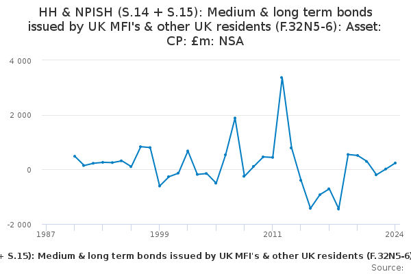 Download this time seriesHH & NPISH (S.14 + S.15): Medium & long term bonds issued by UK MFI's & other UK residents (F.32N5-6): Asset: CP: £m: NSA
