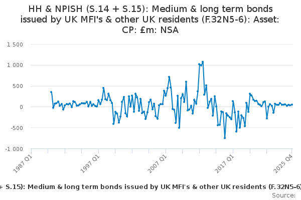 Download this time seriesHH & NPISH (S.14 + S.15): Medium & long term bonds issued by UK MFI's & other UK residents (F.32N5-6): Asset: CP: £m: NSA
