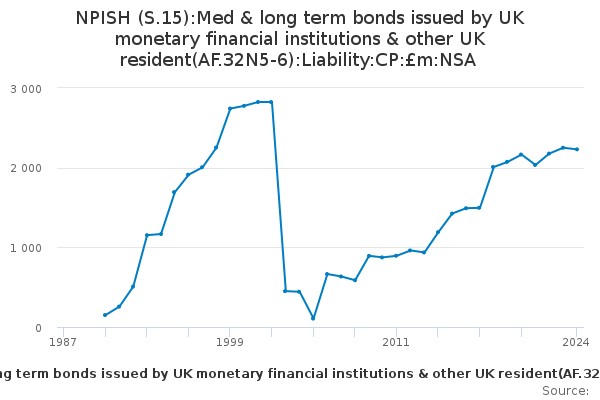 Download this time seriesNPISH (S.15):Med & long term bonds issued by UK monetary financial institutions & other UK resident(AF.32N5-6):Liability:CP:£m:NSA