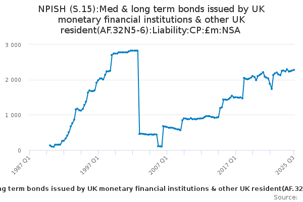 Download this time seriesNPISH (S.15):Med & long term bonds issued by UK monetary financial institutions & other UK resident(AF.32N5-6):Liability:CP:£m:NSA