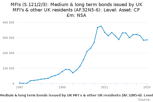 Download this time seriesMFIs (S.121/2/3): Medium & long term bonds issued by UK MFI's & other UK residents (AF.32N5-6): Level: Asset: CP £m: NSA