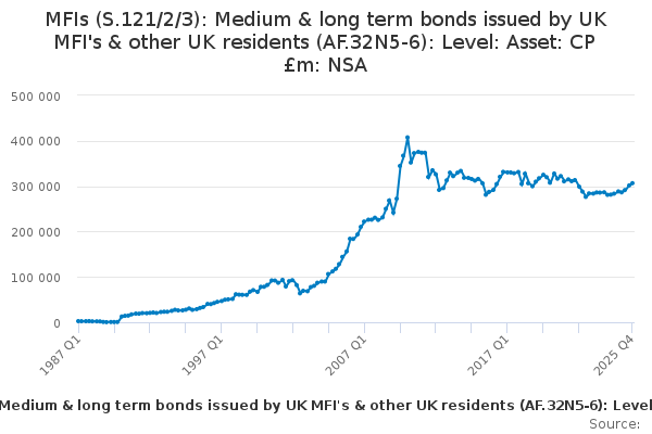 Download this time seriesMFIs (S.121/2/3): Medium & long term bonds issued by UK MFI's & other UK residents (AF.32N5-6): Level: Asset: CP £m: NSA