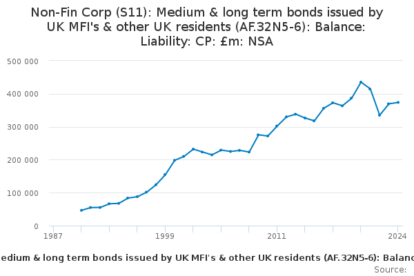 Download this time seriesNon-Fin Corp (S11): Medium & long term bonds issued by UK MFI's & other UK residents (AF.32N5-6): Balance: Liability: CP: £m: NSA