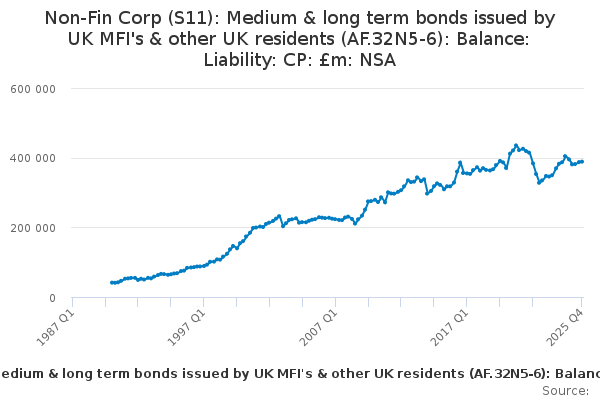 Download this time seriesNon-Fin Corp (S11): Medium & long term bonds issued by UK MFI's & other UK residents (AF.32N5-6): Balance: Liability: CP: £m: NSA