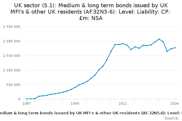 Download this time seriesUK sector (S.1): Medium & long term bonds issued by UK MFI's & other UK residents (AF.32N5-6): Level: Liability: CP: £m: NSA