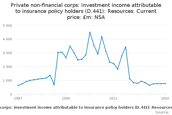Download this time seriesPrivate non-financial corps: Investment income attributable to insurance policy holders (D.441): Resources: Current price: £m: NSA