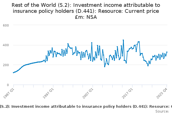 Download this time seriesRest of the World (S.2): Investment income attributable to insurance policy holders (D.441): Resource: Current price £m: NSA