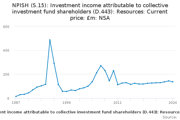 Download this time seriesNPISH (S.15): Investment income attributable to collective investment fund shareholders (D.443): Resources: Current price: £m: NSA