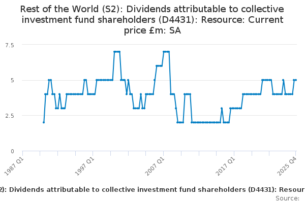 Download this time seriesRest of the World (S2): Dividends attributable to collective investment fund shareholders (D4431): Resource: Current price £m: SA