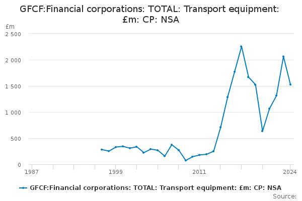 Download this time seriesGFCF:Financial corporations: TOTAL: Transport equipment: £m: CP: NSA