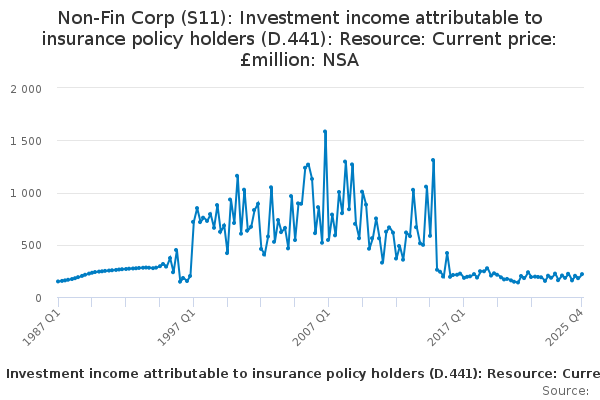 Download this time seriesNon-Fin Corp (S11): Investment income attributable to insurance policy holders (D.441): Resource: Current price: £million: NSA
