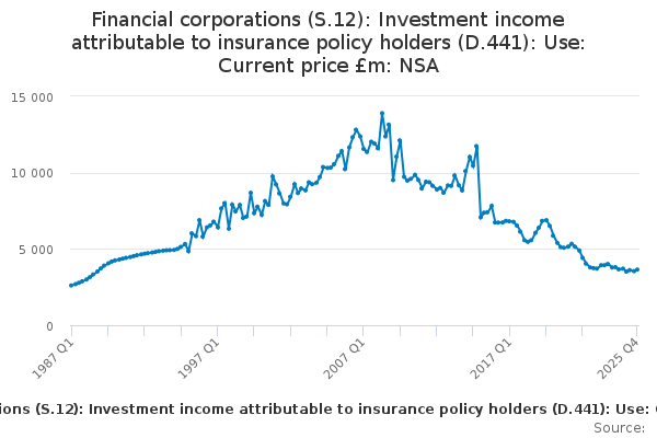 Download this time seriesFinancial corporations (S.12): Investment income attributable to insurance policy holders (D.441): Use: Current price £m: NSA