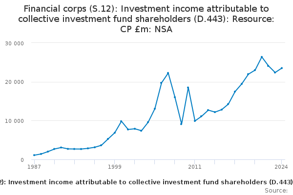 Download this time seriesFinancial corps (S.12): Investment income attributable to collective investment fund shareholders (D.443): Resource: CP £m: NSA