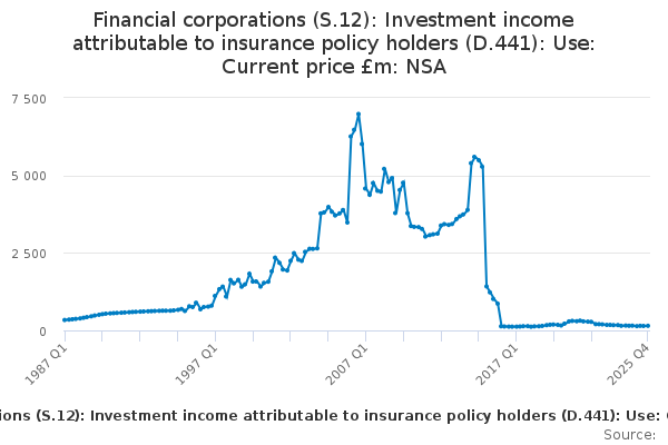 Download this time seriesFinancial corporations (S.12): Investment income attributable to insurance policy holders (D.441): Use: Current price £m: NSA