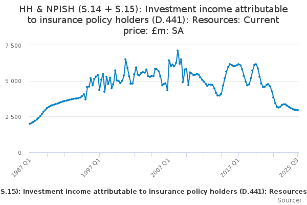 Download this time seriesHH & NPISH (S.14 + S.15): Investment income attributable to insurance policy holders (D.441): Resources: Current price: £m: SA