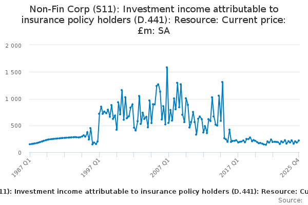 Download this time seriesNon-Fin Corp (S11): Investment income attributable to insurance policy holders (D.441): Resource: Current price: £m: SA