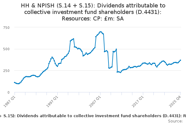 Download this time seriesHH & NPISH (S.14 + S.15): Dividends attributable to collective investment fund shareholders (D.4431): Resources: CP: £m: SA