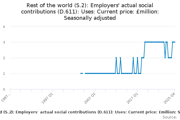 Download this time seriesRest of the world (S.2): Employers' actual social contributions (D.611): Uses: Current price: £million: Seasonally adjusted