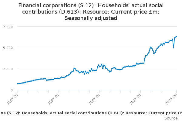 Download this time seriesFinancial corporations (S.12): Households' actual social contributions (D.613): Resource: Current price £m: Seasonally adjusted