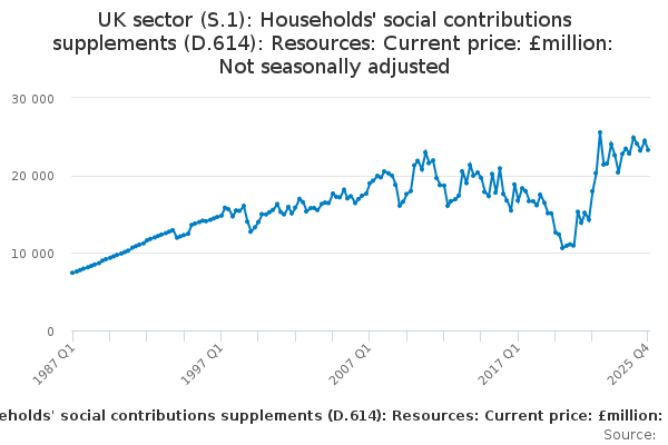Download this time seriesUK sector (S.1): Households' social contributions supplements (D.614): Resources: Current price: £million: Not seasonally adjusted