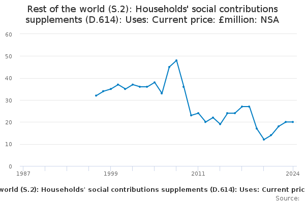 Download this time seriesRest of the world (S.2): Households' social contributions supplements (D.614): Uses: Current price: £million: NSA