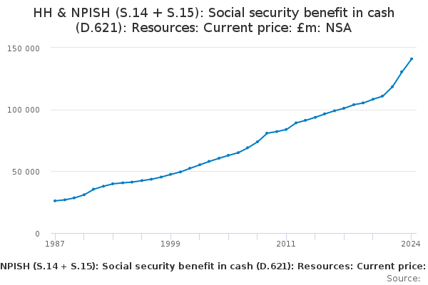 Download this time seriesHH & NPISH (S.14 + S.15): Social security benefit in cash (D.621): Resources: Current price: £m: NSA