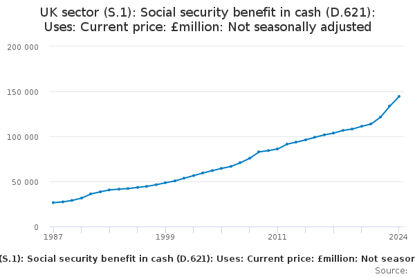 Download this time seriesUK sector (S.1): Social security benefit in cash (D.621): Uses: Current price: £million: Not seasonally adjusted