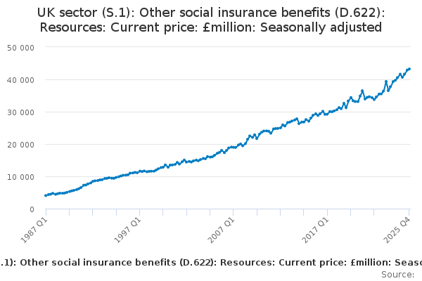 Download this time seriesUK sector (S.1): Other social insurance benefits (D.622): Resources: Current price: £million: Seasonally adjusted