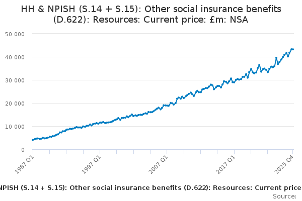 Download this time seriesHH & NPISH (S.14 + S.15): Other social insurance benefits (D.622): Resources: Current price: £m: NSA