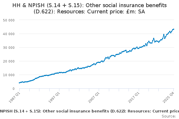 Download this time seriesHH & NPISH (S.14 + S.15): Other social insurance benefits (D.622): Resources: Current price: £m: SA