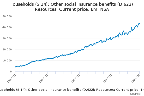Download this time seriesHouseholds (S.14): Other social insurance benefits (D.622): Resources: Current price: £m: NSA