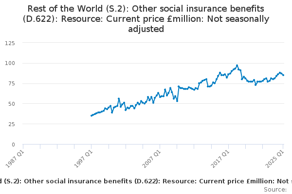 Download this time seriesRest of the World (S.2): Other social insurance benefits (D.622): Resource: Current price £million: Not seasonally adjusted