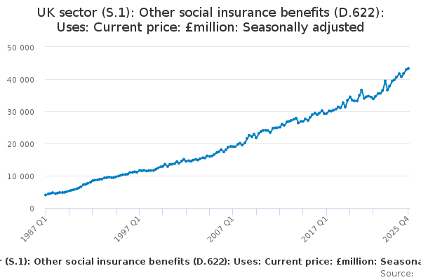 Download this time seriesUK sector (S.1): Other social insurance benefits (D.622): Uses: Current price: £million: Seasonally adjusted